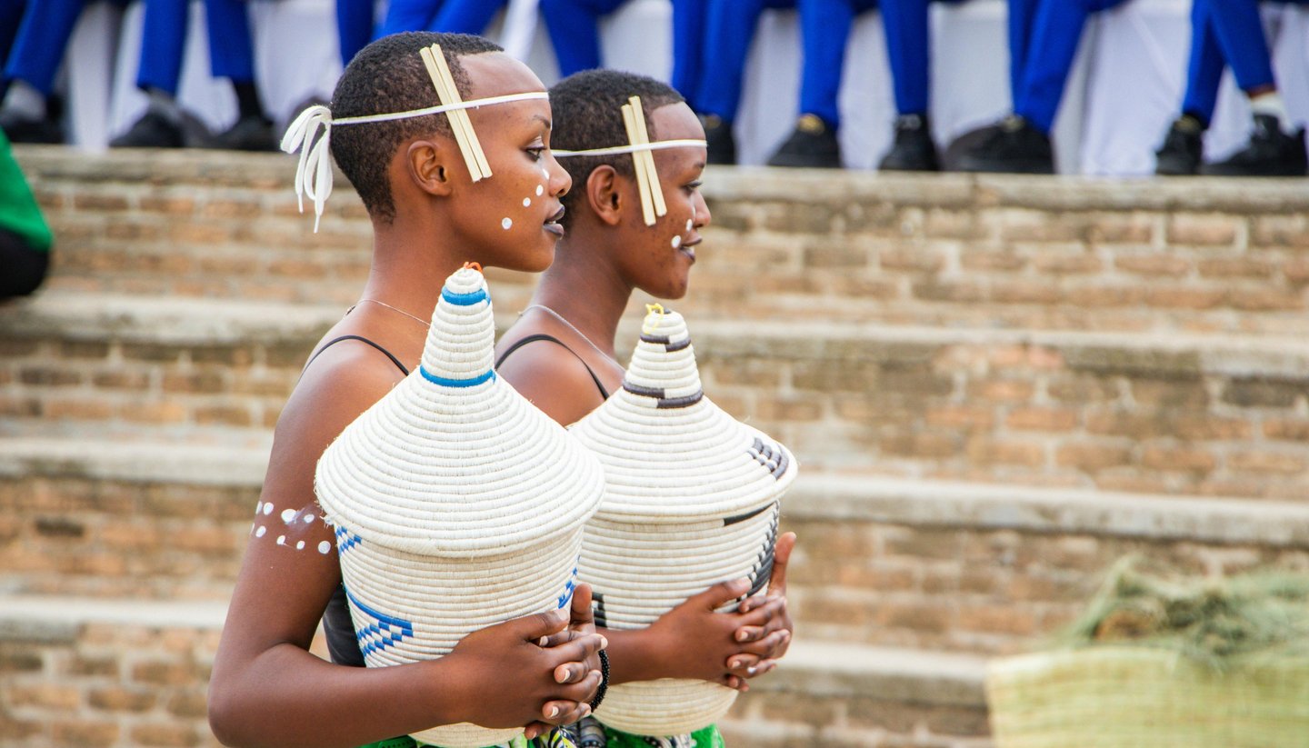 Young women in traditional attire holding Agaseke baskets